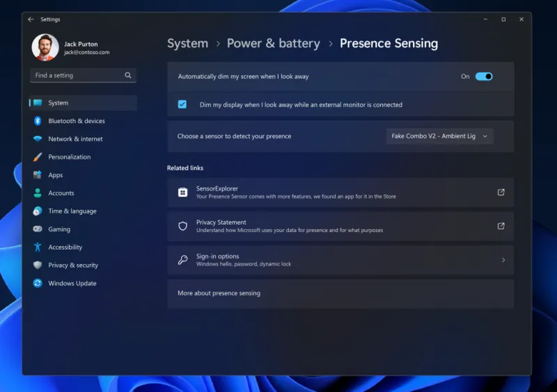 Для компьютеров с датчиками присутствия, поддерживающими функцию определения внимания, вводится адаптивная регулировка яркости. Теперь устройство сможет интеллектуально регулировать яркость экрана, когда вы отводите взгляд, и уменьшать ее, когда вы оглядываетесь. Эти настройки можно найти в разделе Настройки > Конфиденциальность и безопасность > Датчик присутствия, если устройство поддерживает эту функцию.