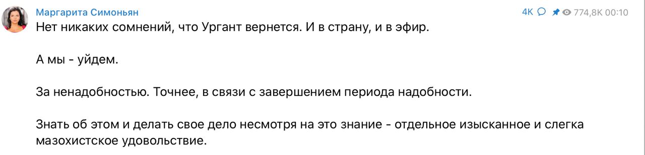 Такой пост появился у главы RT Маргариты Симоньян на фоне сообщений о закрытии «Вечернего Урганта»:
