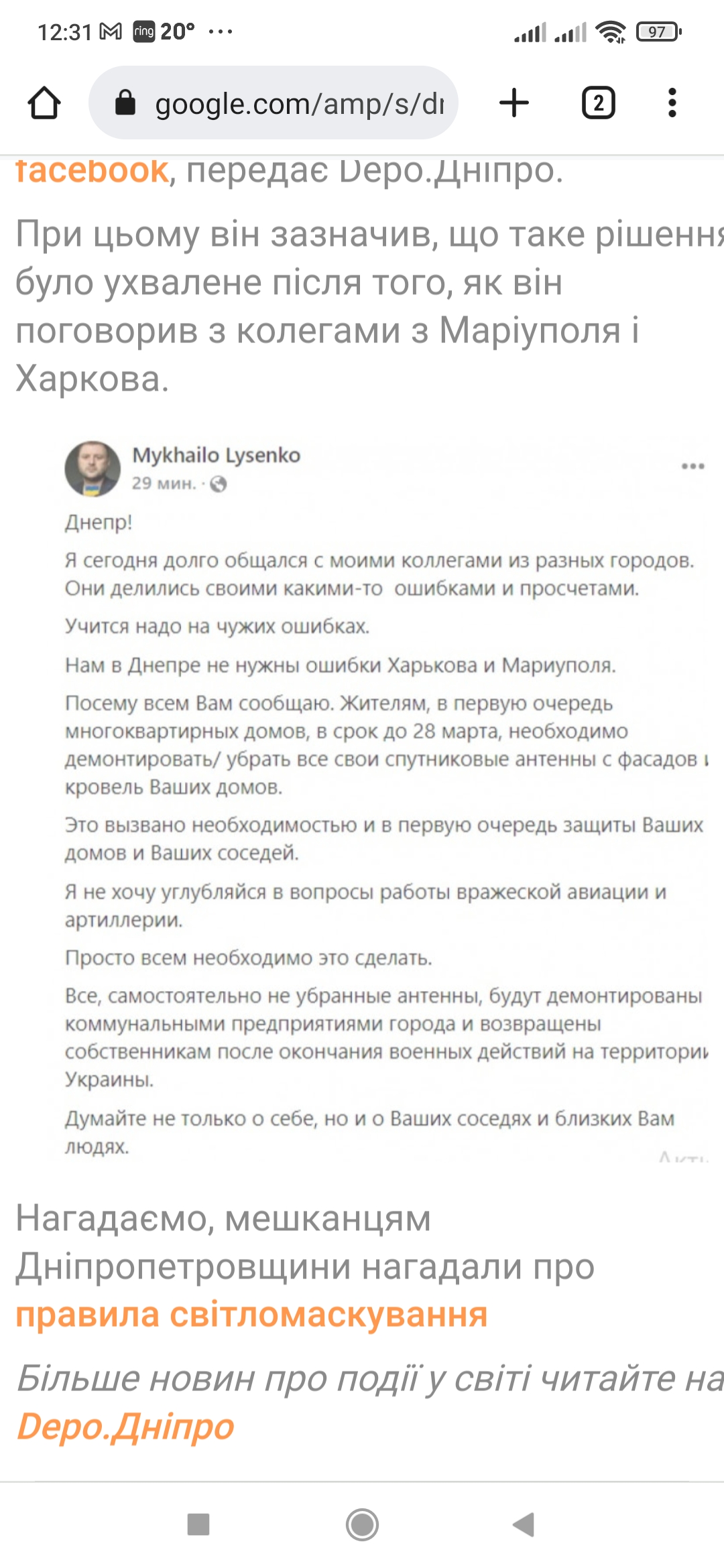 "В Днепре до 28 марта планируют снять спутниковые тарелки со всех зданий.