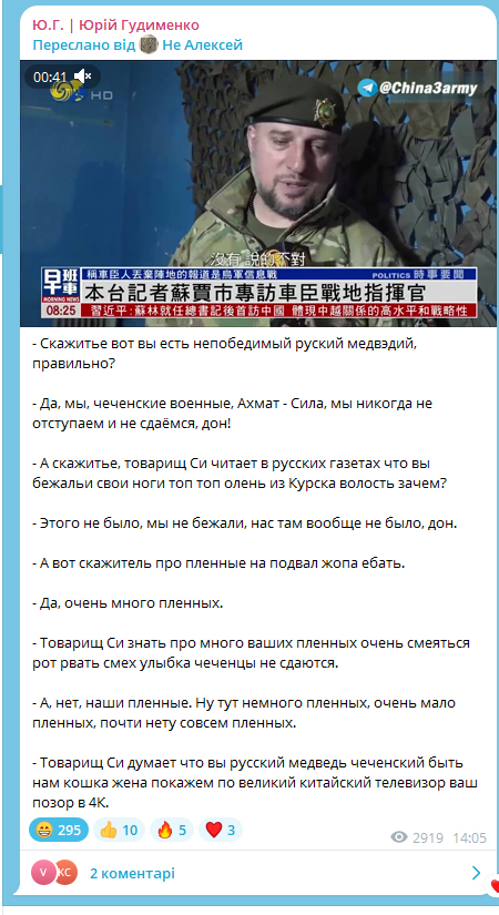 "Я думаю, что в ближайшие два-три месяца это полностью все завершится и причем завершится не только на курском направлении, а полностью вся СВО", - отметил он в интервью китайскому военному корреспонденту Лу Юйгуану, фрагмент которого был показан по телеканалу Phoenix. (Отсюда.)