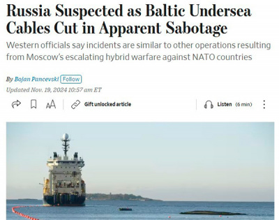 С ноября прошлого года пошли сообщения о повреждении подводных кабелей интернет-связи в Балтийском море. Сначала один инцидент, потом второй, затем третий. Каждый раз в этом участвовали всякие подозрительные корабли, причем при этом наблюдалось усиление активности российских военных кораблей в этих зонах. При этом главным подозреваемым сразу называли Россию - ну, репутация у путинского Мордора такая, они всегда первые в деле где-нибудь кому-нибудь по-крупному поднасрать.