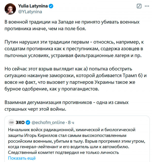 Юля знает военные традиции Запада и чтит их. Перед заморозкой не надо было обострять, считает Юля. Взаимная дегуманизация - вот одна из самых страшных черт. Украинцы должны уважать путинских орков - Юля это говорит с первых дней войны.