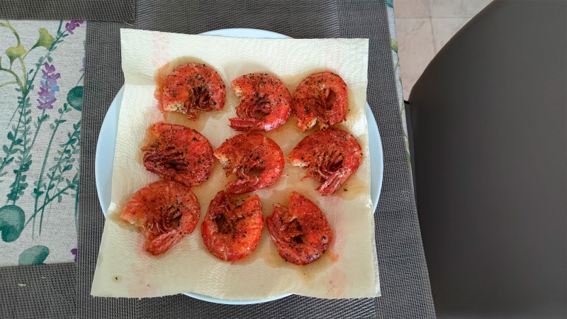 Пришел страшно голодный, нажарил себе сковородку отборных аргентинских креветок с чесноком и специями, благо креветки были уже размороженные.