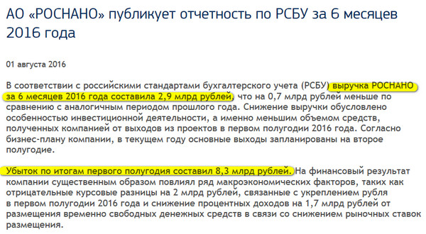 Ничего, скоро Сечин снова рубль обрушит, может у "Роснано" прибыль появится. Хотя тогда наверное выяснится, что они перевели всё в рубли и снова оказались в ж... со своими "инвестициями".