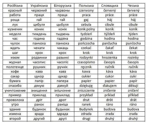 К примеру, в таблице использовано слово "чулок", но если взять слово "колготки" и посмотреть, как оно выглядит на тех же самых языках ("укр-бел-пол-слов-чеш"), то эта "теория" рассыпется в прах.