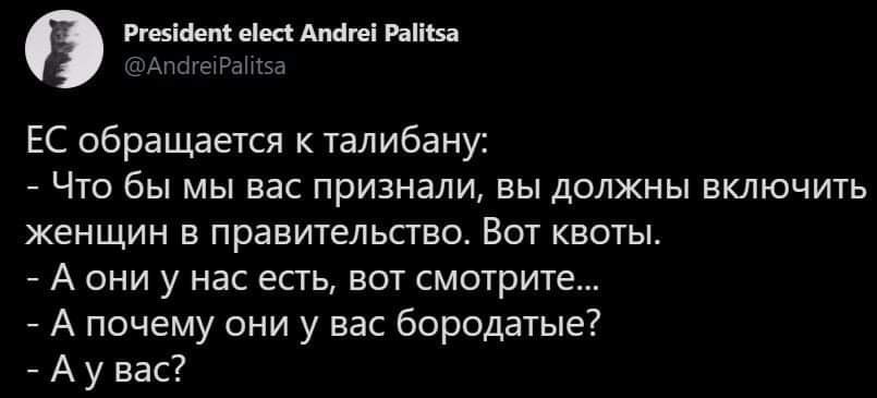 Я тут несколько раз уже писал, в общем-то... Талибам сейчас нужно максимально "легитимизироваться" в глазах мирового сообщества (или как минимум соседних стран). Поэтому будут из кожи вон лезть, чтобы показать свою якобы "цивильность" – иначе им вместе со страной кирдык без внешней помощи.