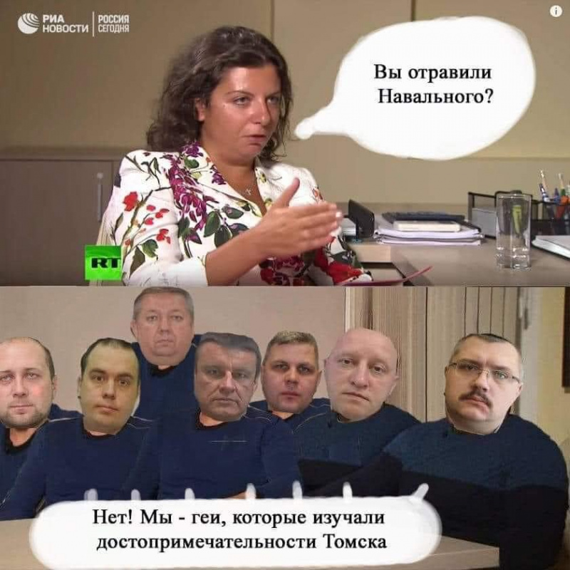 Здесь просто отсылка к интервью Мишкина и Чепиги Маргарите Симоньян по поводу отравления Скрипалей. Собственно, из этого интервью и кадр с Симоньян, а также со свитерами этих добрых молодцев.