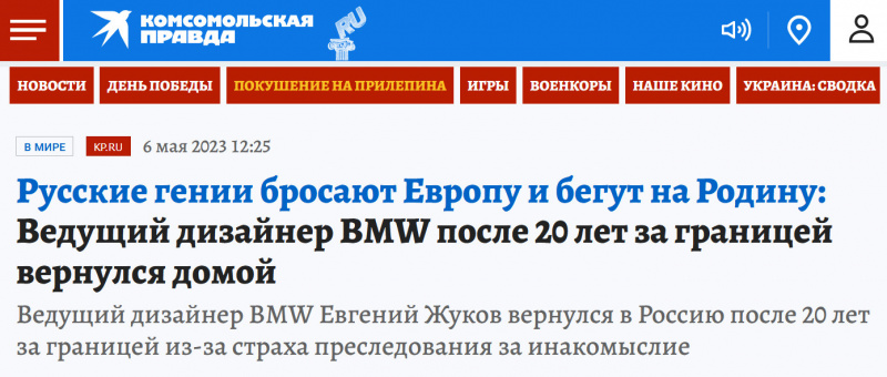 Из статьи следует, что этот "русский гений" и "ведущий дизайнер" работал 12 лет (а не 20) какой-то мелкой сошкой в подразделении BMW, производящем мотоциклы. И с 2014 года страшно переживал за то, что в СМИ не рассказывают про распятых мальчиков и про то, что восимь лет данбили бамбас, ну и в итоге он вернулся-то таки на милую сердцу родину. Теперь работает дизайнером в какой-то АО "Русская механика" в Рыбинске. Флаг ему в руки.