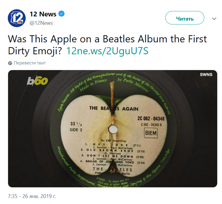 Выход песни Hey Jude британской рок-группы The Beatles в 1968 году в США оказался на грани срыва из-за изображения на пластинке яблока, напомнившего дистрибьюторам вагину. Об этом сообщает The Independent.
