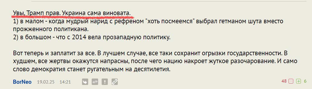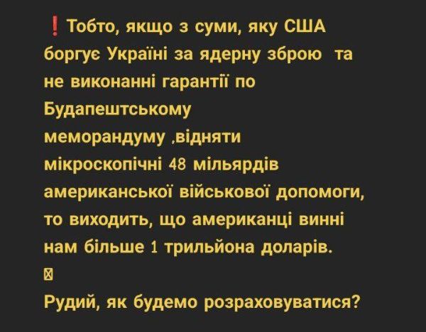 Ну да, а и действительно - зачем Зеленский начал эту войну, не понимает Трамп? 350 миллиардов долларов выманил Зеленский у Сонного Джо, а обратно ни хера не вернул! И рейтинги у него низкие. И выборы он не хочет проводить - говорит, что какая-то там Конституция запрещает. Какая, на хер, Конституция, ты мужик или нет? Проведи выборы, дай Путину посадить в президенты свою марионетку и уймись уже наконец.