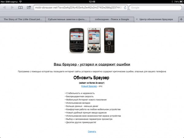Захожу на сайт "Собеседника" с обычного компа. Сайт открывается, хотя и очень криво (нет скроллинга ни под одним браузером). Захожу на сайт "Собеседника" с какого-то мобильного устройства - айфона, айпэда, Galaxy Note - идет переадресация на сайт какой-то явной полупорнушной шняги и выскакивает сообщение о том, что мой браузер, дескать, устарел, поэтому немедленно скачайте новый браузер, который, разумеется, в лучшем случае напихает мне кучу рекламы, а в худшем - занесет тонну троянов.