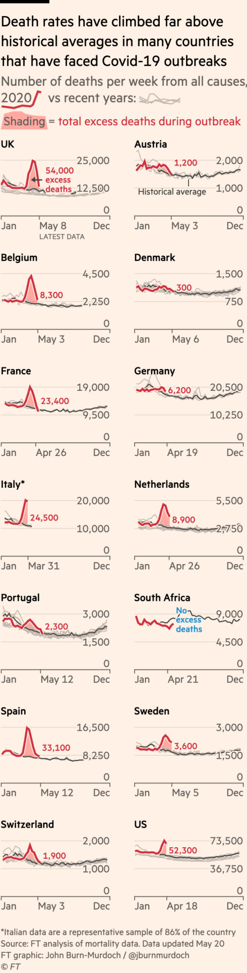 По Испании на 12 мая официально умерших от короны было 26 тысяч, а вот избыточная смертность составляет 33000! Можно конечно рассказывать истории, что это всё "умершие от паники", но вот только график отлично показывает, как после введения строгих мер ищзбыточная смертность по инерции еще какое-то время растет, достигает пика а потом резко падает. На данный момент смертность в Испании вернулась к средним значениям, так что паника по поводу "массово звереющих и самоубивающихся на карантине испанцев" никакого реального основания под собой не имеет.