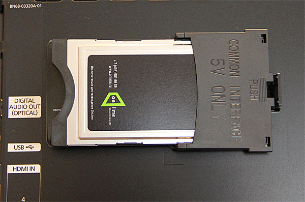 Карта вставляется в модуль, модуль с помощью специального переходника (идет в комплекте с телевизором) вставляется в CI.