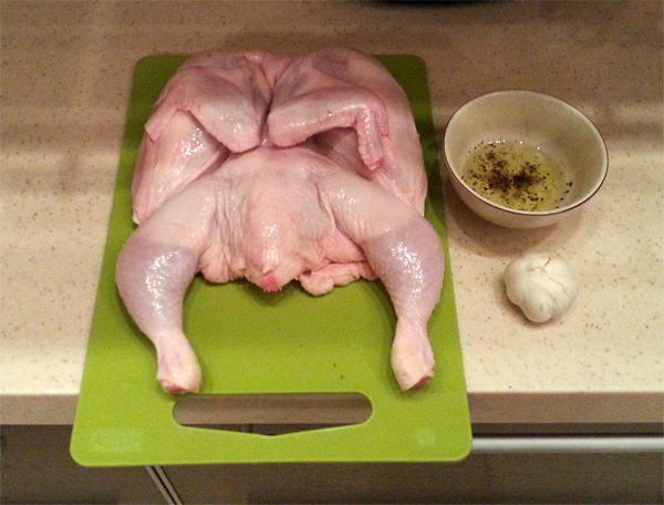 Alejik: Еще рекомендую немного отбить зверя перед жаркой, несильно, чтобы не поломать косточки, но при этом сделать цыпленка чуть-чуть "поплоще".