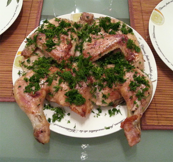 Просили рассказать про вчерашнего цыпленка. Да ничего особенного, обычный цыпленок табака почти по стандартному рецепту.