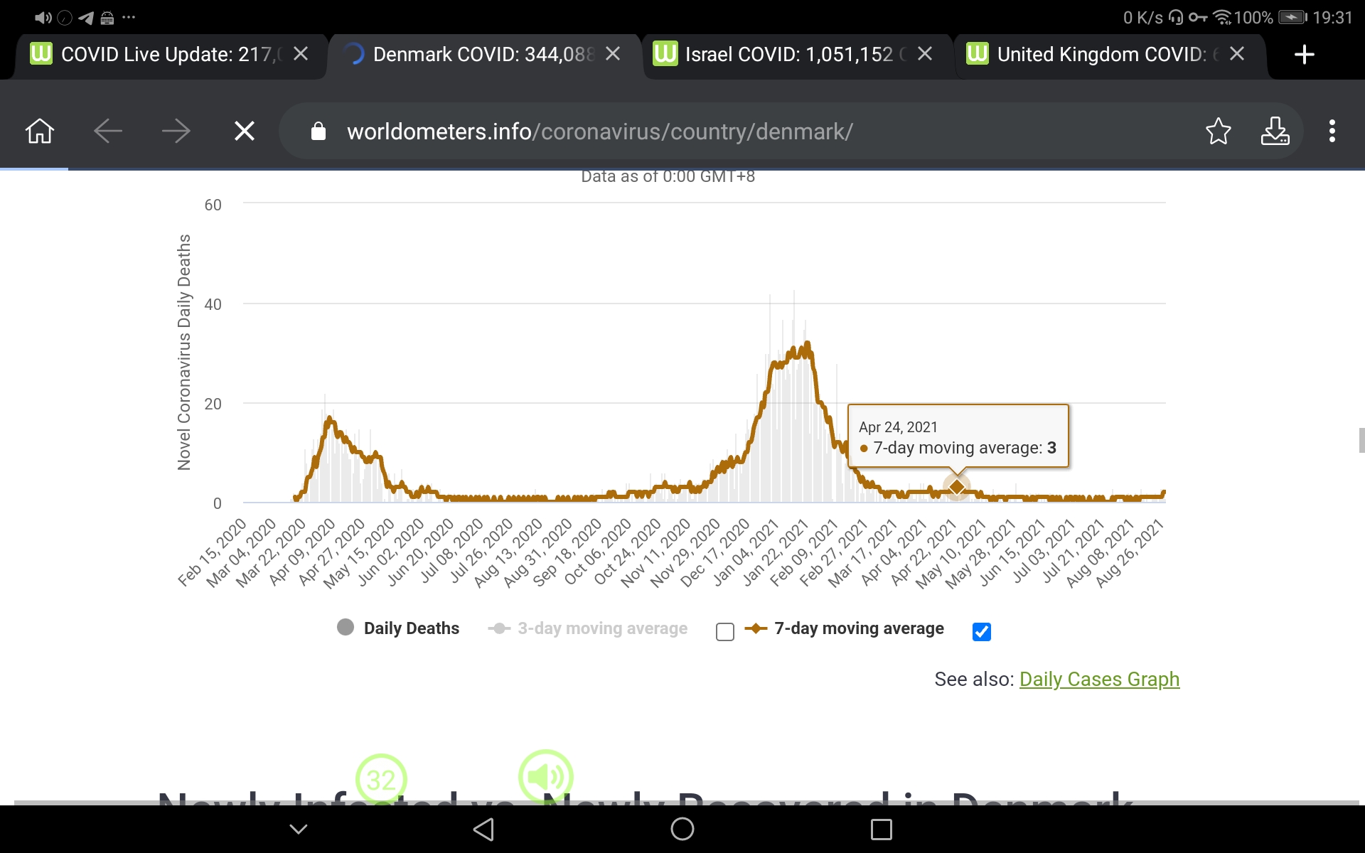 В Дании к 14 февраля зимняя волна припала и, начиная с 10 марта и по конец августа среднее семидневное число смертей неизменно равно 1-3. А между тем Дельта рулит в Дании примерно с середины июля. Ежедневное число заражений по сравнению с пиками зимней волны упало в 3-4 раза. Локдаун при этом отменён. Весь этот позитив стал возможен только благодаря тотальной вакцинации.