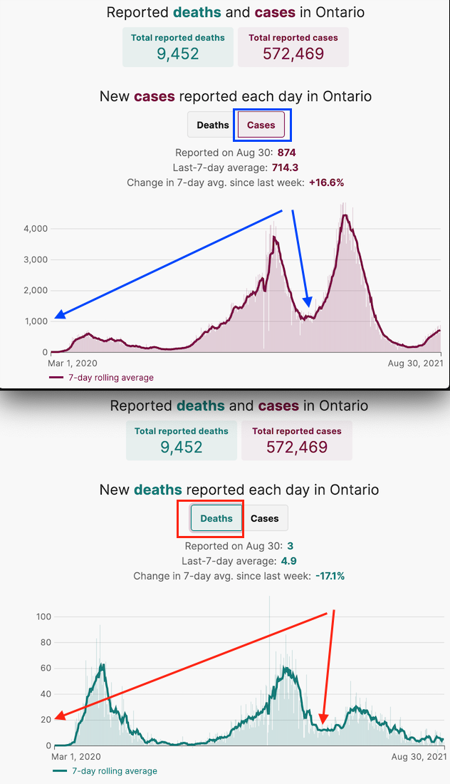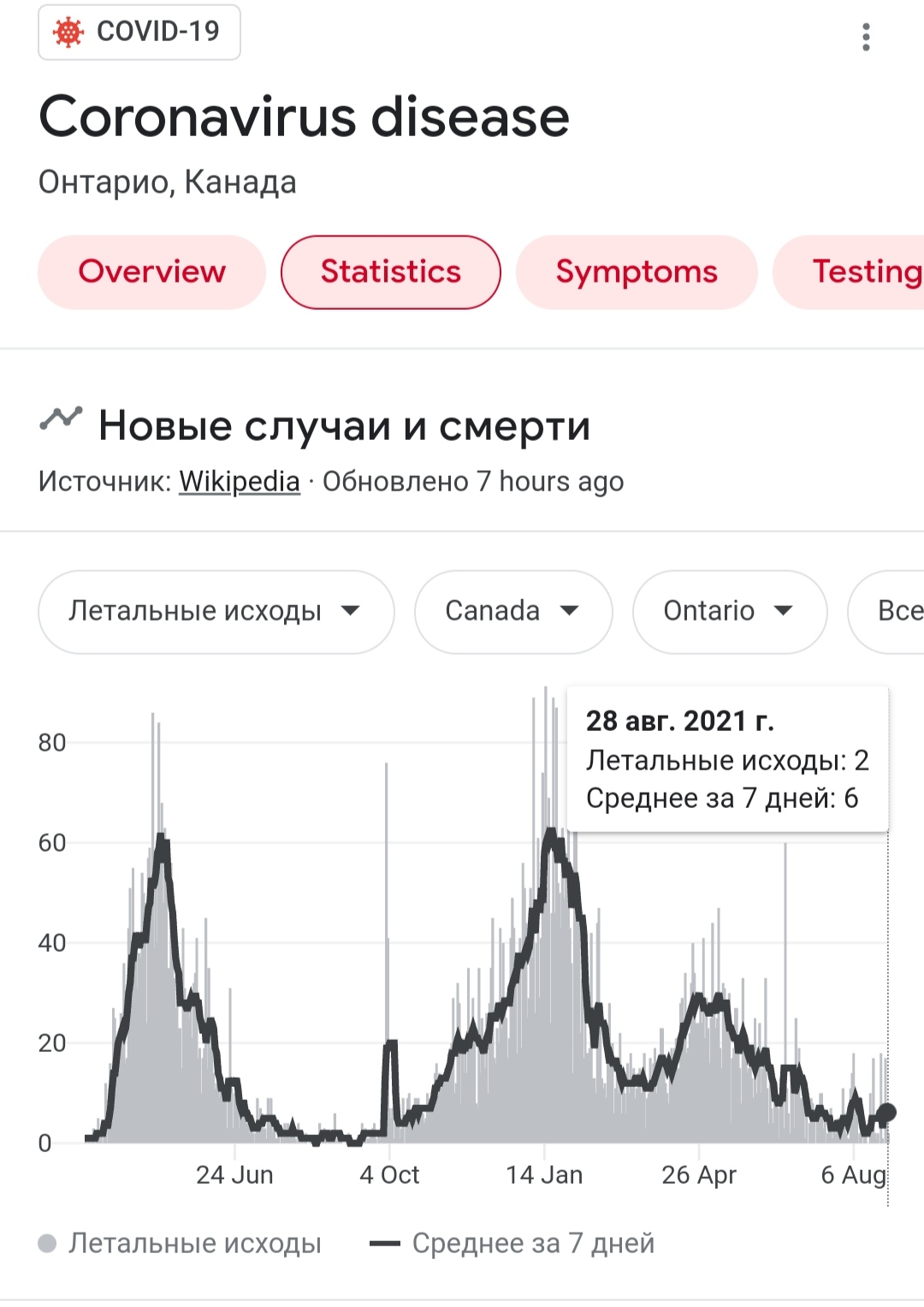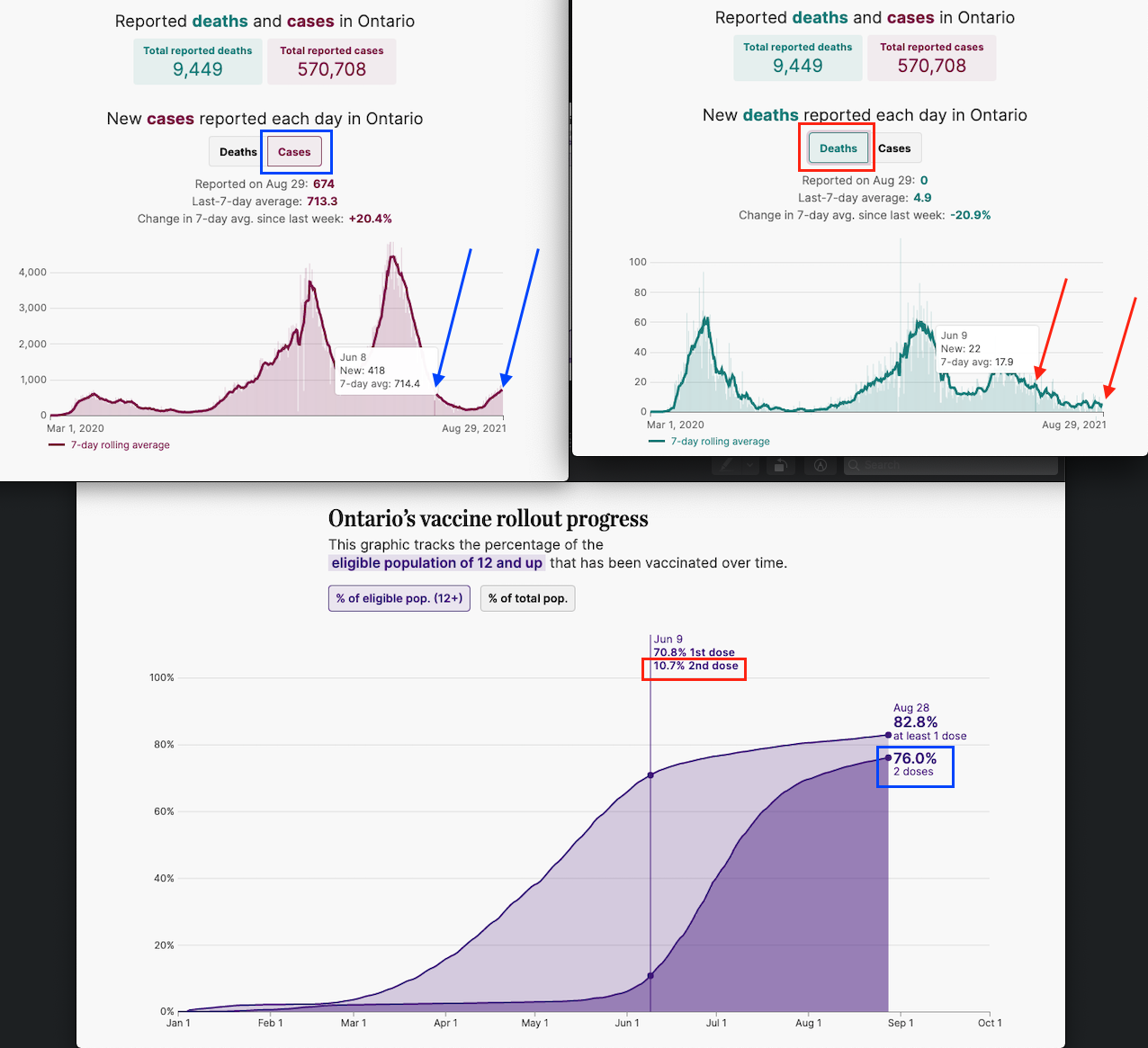 Но смертность почему-то ни фига не по нулям - и совпадает со смертностью предыдущей волны (что отчасти объяснимо, т.к. из заболевших только 20% полностью привиты). И онтарийское правительство, наоборот, приостановило действие плана по открытию экономики, увы