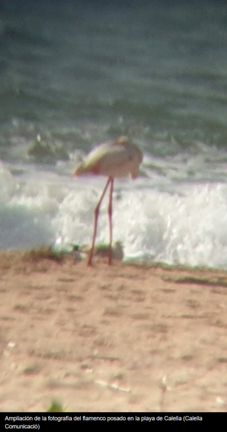 Дельфины, подплывающие близко к берегу при пустующих пляжах, это еще не все. Сегодня на пляже нашего городка обнаружили фламинго (исп.), коих здесь отродясь не бывало. Снимок плохого качества, потому что снимали с большого расстояния.