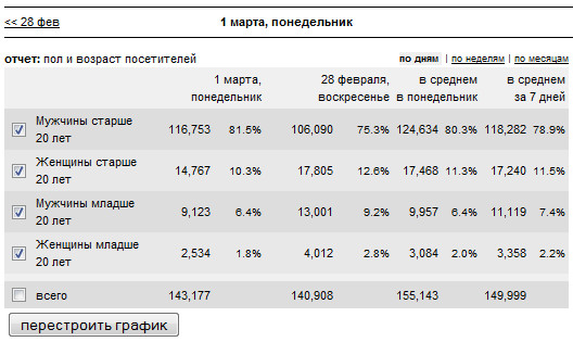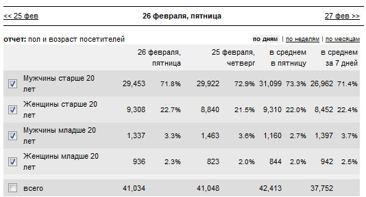 Поигрался в Liveinternet со статистикой "Демография". Вообще очень интересные данные. Вот, например, весь Рунет (на примере посетителей где-то 25% всех сайтов).