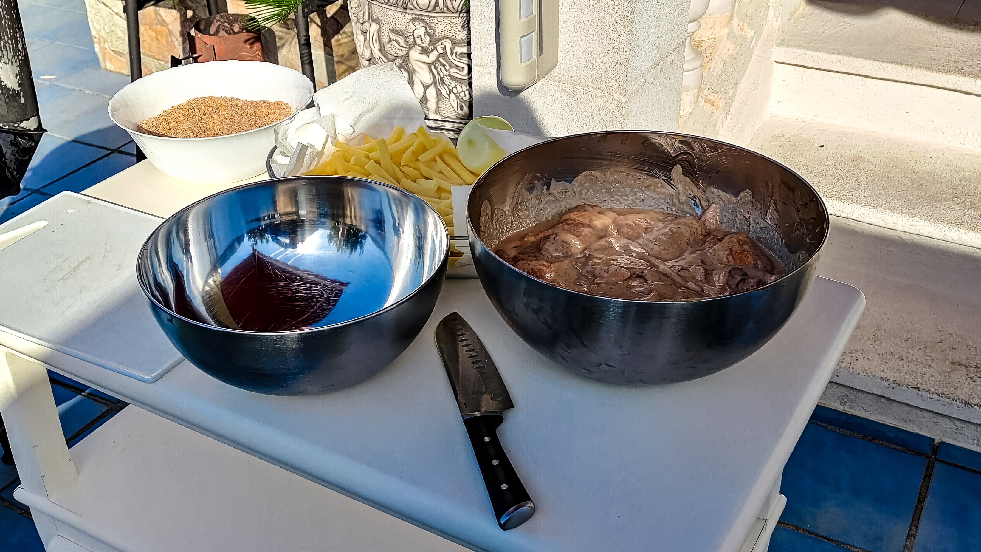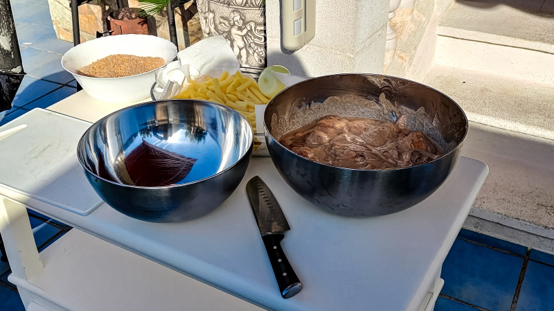 Заправлены в планшеты космические карты - в том смысле, что курица в соусе ждет обсыпки, обсыпка собственного приготовления также готова, картошка с луком порезана и будет готовиться последней.