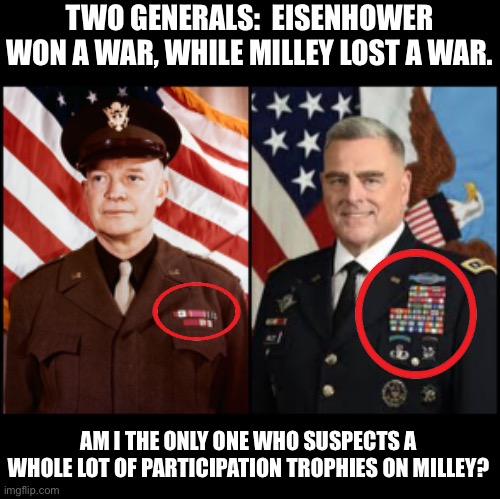 Ну или популярный в штатах мем. Слева генерал Эйзенхауэр, выигравший 2-ю мировую, справа - генерал Майли, просравший войну в Афганистане.