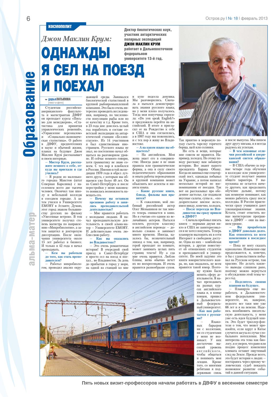 Ещё через час страшный иностранец, в миру американский профессор, доктор биологических наук, специалист по проектному менеджменту, герой антарктических полярных экспедиций Джон Маклин Крум был помыт, побрит, одет в свежую рубашку, накормлен, весь сиял и любезно общался с соседями по вагону через переводчицу. В чём была причина его предыдущего безобразного поведения, он объяснять пассажирам не стал.