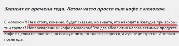 Есть мнение, что если усопший успел при жизни хоть раз выпить кофе с молоком и не умереть, то он уже никогда от него не умрет. - Иммунитет'c