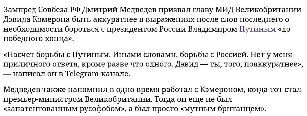 Да уж, грамотеи, даже не вычитывают собственные тексты: "Медведев также напомнил в одно время работал с Кэмероном…"