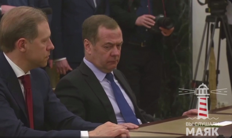 Ну и просто фоточка Димона из видео. Мы понимаем, у Дмитрия Анатольевича столько сил занимает его работа в Телеграме, что, кажется, он сейчас наблюёт товарищу Путину прямо на стол. Скандал же будет...