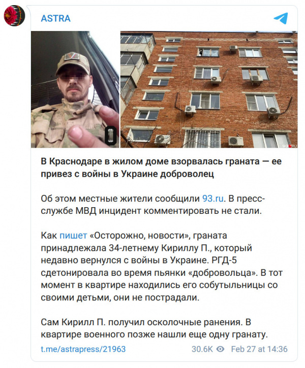 А если зека, например, не утилизировали, и он героем вернулся домой, а там, например, угрохал кого-то или гранату взорвал, то за новость об этом - тоже до пяти лет, потому что это "критика участников военной операции".