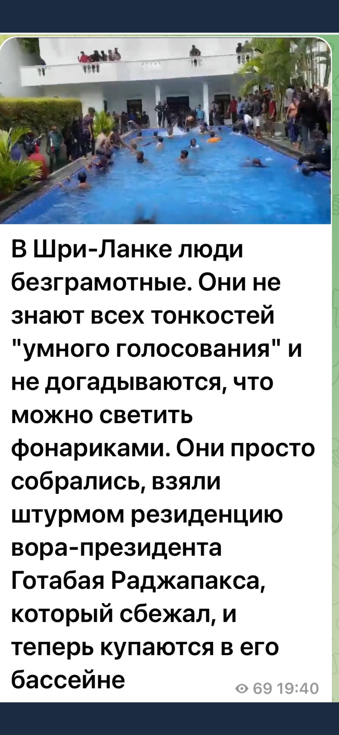 На Шри-Ланке люди не "просто собрались". Им "просто" стало нечего жрать. В буквальном смысле. Еды нет. Топлива, чтобы его из сельских районов подвезти, нет.