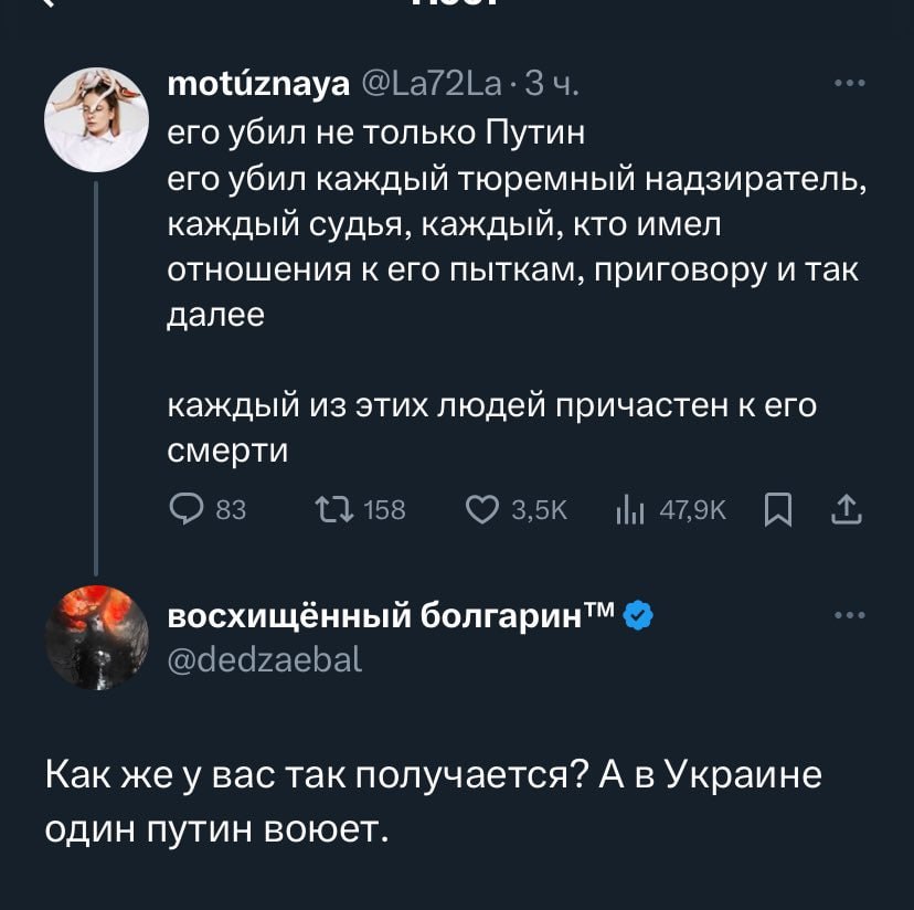 Не менее возмутительно ведут себя казахи. Один из них посмел дать в Х пост twitter.com с текстом "Пожалуйста, не носите цветы памяти Навальному к памятникам жертв репрессий в Центральной Азии. Это неуважение к людям, которых он сравнивал с тараканами. Горюйте у себя дома, спасибо."