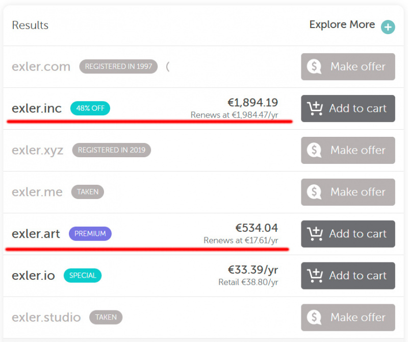 Смотрел, какие свободные, ну и наткнулся на вот такую штуку. Нормальненько так за exler.inc - €1894 в год. Да и exler.art - тоже стоит кучерявенько.
