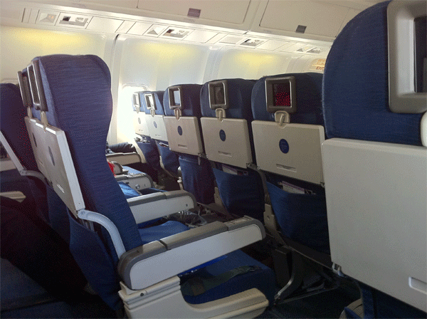 Оказалось, что это просто первый десяток рядов в экономе. В общем-то, ничем не отличается. Правда, в экономе не дали бы место у окна - типа закончились. Однако потом выяснилось, что я все-таки не зря платил $109. Народу в самолете было мало, этот эконом плюс был почти не заполнен, однако из эконома туда пересаживаться не давали - мол, платите деньги. В результате я летел с полным комфортом - место рядом свободно (там два кресла у окна) , впереди и сзади - тоже свободно. Красота.
