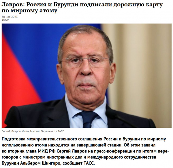Ну и вот наконец-то сообщили, ура! Они подписали дорожную карту по мирному атому! С Бурунди, Карл! Со страной, которая почти 100% требуемой ей электроэнергии получает за счет гидроэлектростанций!
