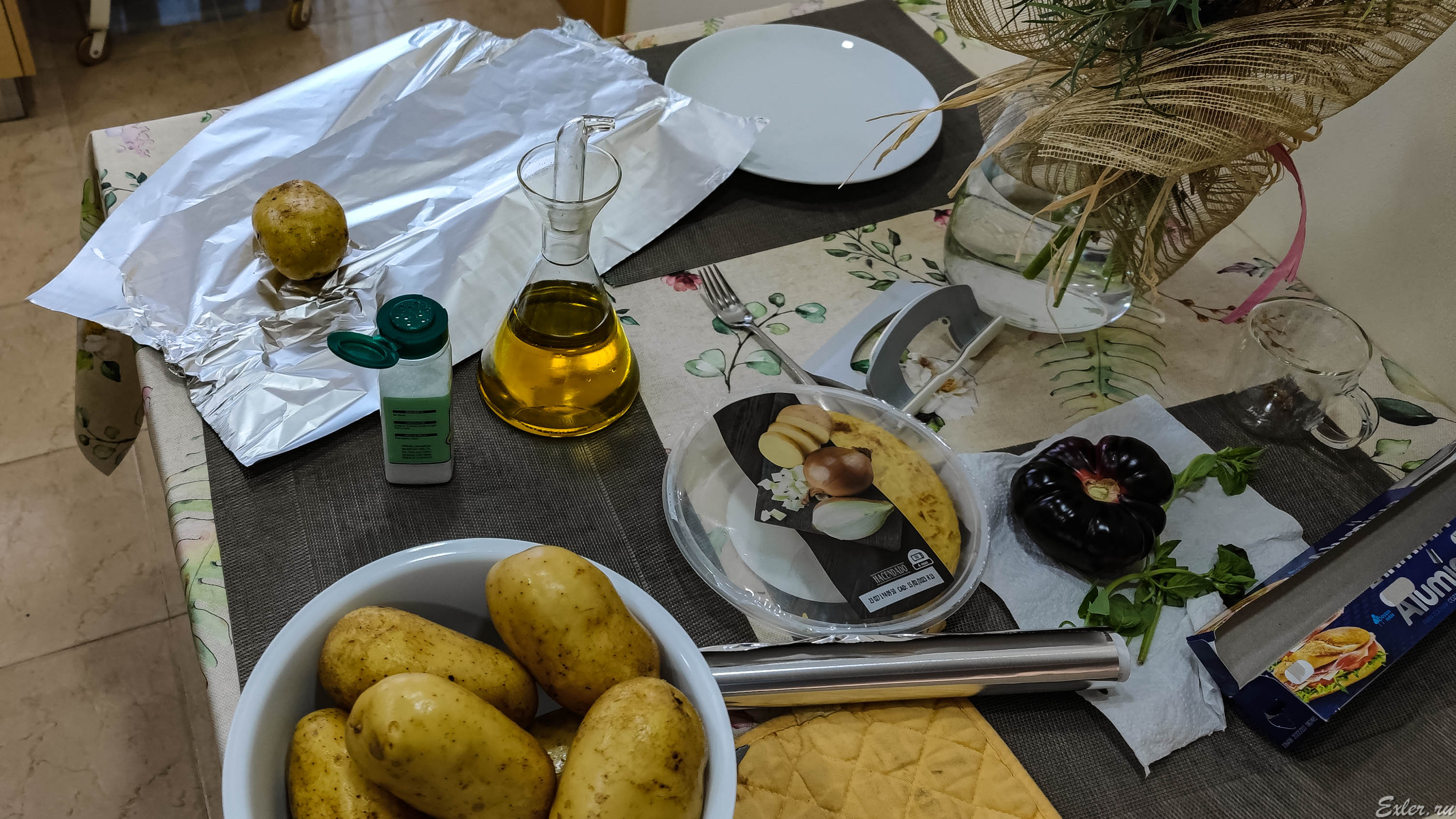 Без фольги картошка тоже получится нормально, и 40 минут всего, вместо часа, но более сухая (зависит еще от сорта картошки, некоторая и без фольги не сухая). С фольгой будет больше напоминать по консистенции пюре. Вместо масла еще можно положить специальный сыр для раклета, вместе с жамбоном (жамбон под сыр), растопить его в духовке (но не сильно). Получается еще вкуснее.