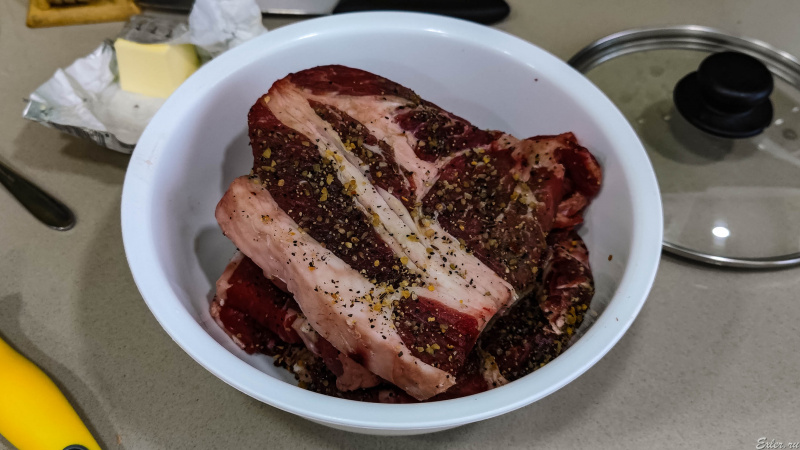 Мясо для решетки в этот раз взяли самое обычное: никаких тебе состаренных чулетонов. Просто толстый край без кости, от которого мясник отрезал два килограммовых куска по паре сантиметров толщиной, я их в свою очередь разрезал пополам (и чтобы в миску поместились, и чтобы готовить было сподручнее) и засыпал монреальской смесью для стейков - очень хорошая штука, я этой смесью предварительно посыпаю не только говядину, но и курицу. Причем смесь я беру конкретную (там куча производителей) - McCormick. Обычно достаточно засыпать этой смесью и на ночь поставить в холодильник.