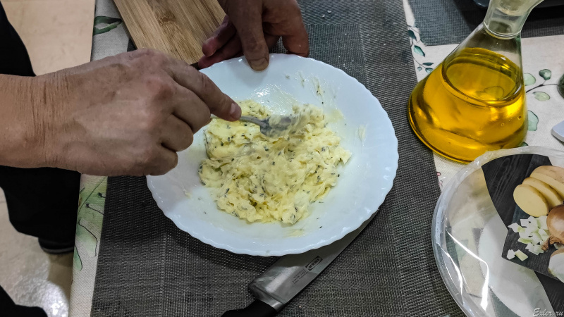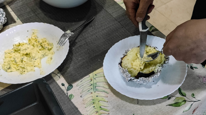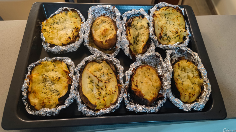 Когда картошка была готова, у каждой картофелины сверху снимается кожура, после чего мякоть картошки разминается вилкой, щедро сдабривается подготовленным соусом, далее картофелина кладется на "блюдечко" из фольги и помещается на противень.