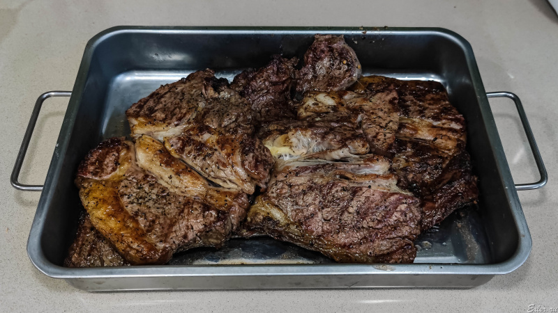 А здесь - обычный толстый край без кости за 17 евро кило (чулетон со здоровой костью - 24 евро кило, что получается почти в два раза дороже, учитывая кость) и получилось просто отлично.