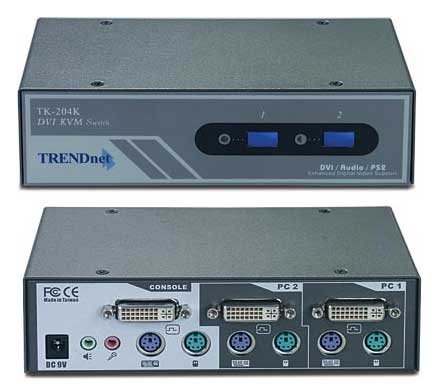 Поэтому нашел штуку получше и поинтереснее - KVM Trendnet TK-204K. Во-первых, он под DVI. А во вторых, он еще служит свитчером для колонок и микрофона, что тоже вполне не лишнее. В результате у меня теперь два компа висят на одной клаве, мыши, мониторе, колонках и микрофоне.