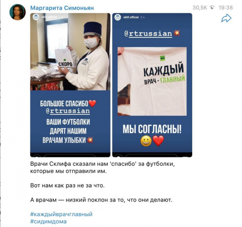 У г-жи Симоньян есть и деньги, и возможности для того, чтобы подарить врачам все что им нужно. Но она предпочла подарить маечки, которые сейчас нужны врачам неизмеримо меньше, чем маски. Да еще и логотип на них налепила, да еще и публично отчиталась об этом.