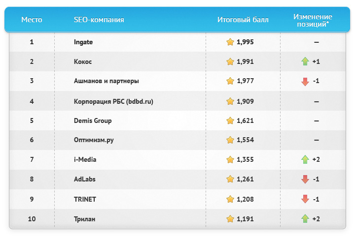 С 2007 года данные рейтинга «Известность бренда SEO-компаний» помогают заказчикам услуг по поисковому продвижению разобраться в многообразии подрядчиков. Позиции агентств в рейтинге, их динамика и количество участников позволяют оценить развитие отрасли в целом, определить лидера и сделать правильный выбор.