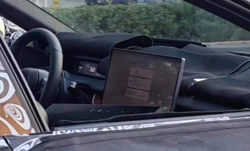 Издание СarNewsChina также публикует шпионские снимки интерьера SU7, на которых виден трехспицевый руль с плоской нижней частью и двумя функциональными ручками и большой центральный экран управления.