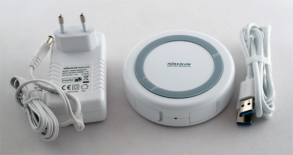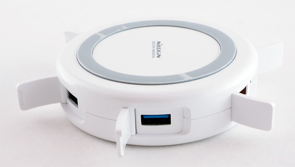 Хаб имеет адаптер питания, один входной порт USB (для подключения к компьютеру), 4 выходных USB 3.0 (для различных устройств), ну и платформу беспроводной зарядки QI (подходит для смартфонов, поддерживающих этот стандарт).