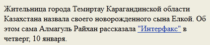 А дамочка долбанулась досрочно и решила назвать сына в честь "главного символа новогоднего праздника". Назвала бы "елью" по-казахски, никто бы не удивлялся.