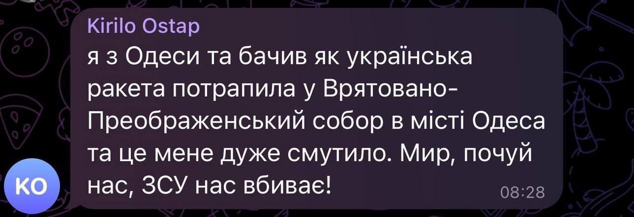 "В ночь на 23 июля российские войска нанесли ракетный удар, в ходе которого собор был поврежден", - такая запись появилась на странице собора в тот момент, когда никакой атаки по городу не было."ukraina.ru