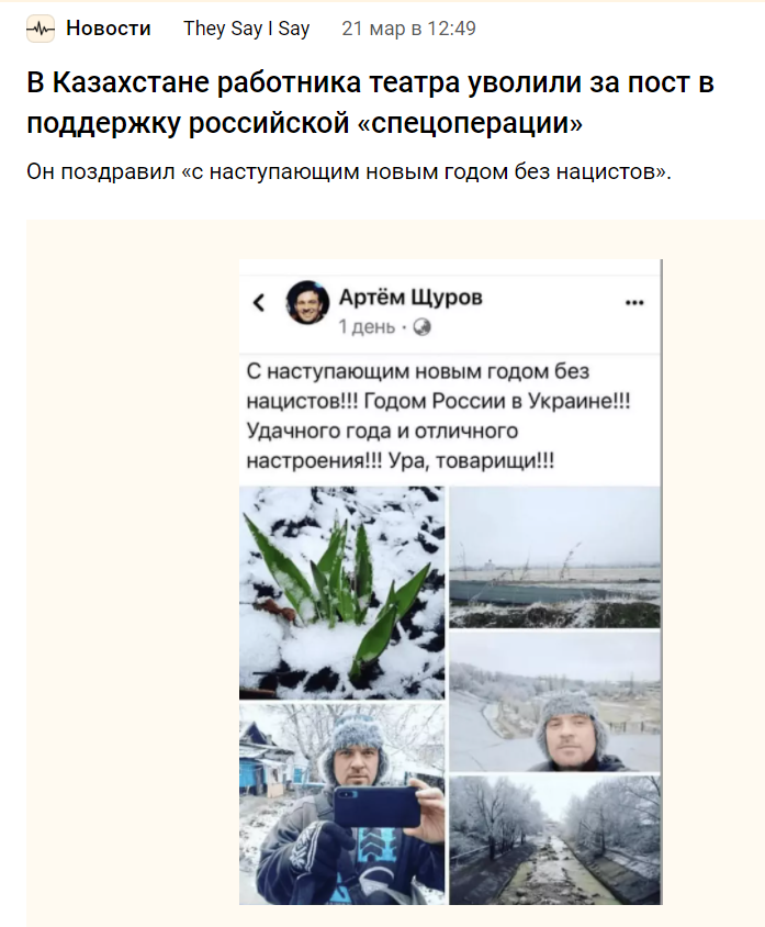 В Алматы в сотрудника театра имени Лермонтова уволили за пост в Фейсбуке в поддержку российской «спецоперации» на Украине.