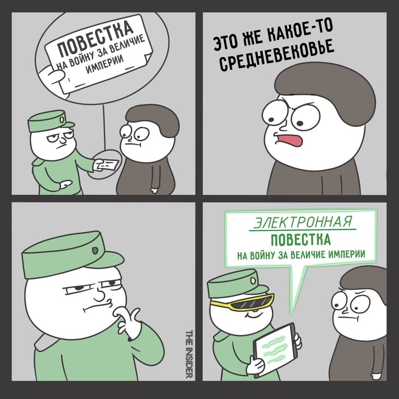Как и ожидалось, такая сущая мелочь, как необходимость лично вручать повестку могилизованному - отменяется. Теперь получение повестки становится почетной обязанностью могилизованного. Повестка будет приходить через "Госуслуги", и как пришла - значит, ты ее получил. Нет у тебя доступа в Интернет, нет компьютера, а кого это волнует? Удалил свою запись на Госуслугах (такую возможность вроде вернули) - это или признак измены Родине, или дискредитация вооруженных сил РФ. Подумал военком тебя вызывать повесткой - должен уловить телепатически и немедленно явиться. Не явился - уголовка. У Путина еще много планов по утилизации собственного населения. На строительстве пирамиды фараона должны погибнуть сотни тысяч рабов, иначе другие фараоны засмеют.
