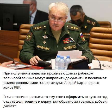 "Военнообязанным, подлежащим призыву и работающим за рубежом, рекомендуется взять отпуск на год и вернуться в Россию для прохождения армейской службы,заявил глава комитета Госдумы по обороне А.Картаполов. После этого россиянин сможет уехать обратно за рубеж. "
