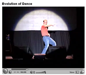 Шестиминутный ролик, в котором мужик демонстрирует эволюцию танца (и, в общем, музыки) примерно с пятидесятых годов прошлого столетия по сегодняшний день - Evolution of Dance. Сделано очень здорово - посмотрите, у кого есть возможность.